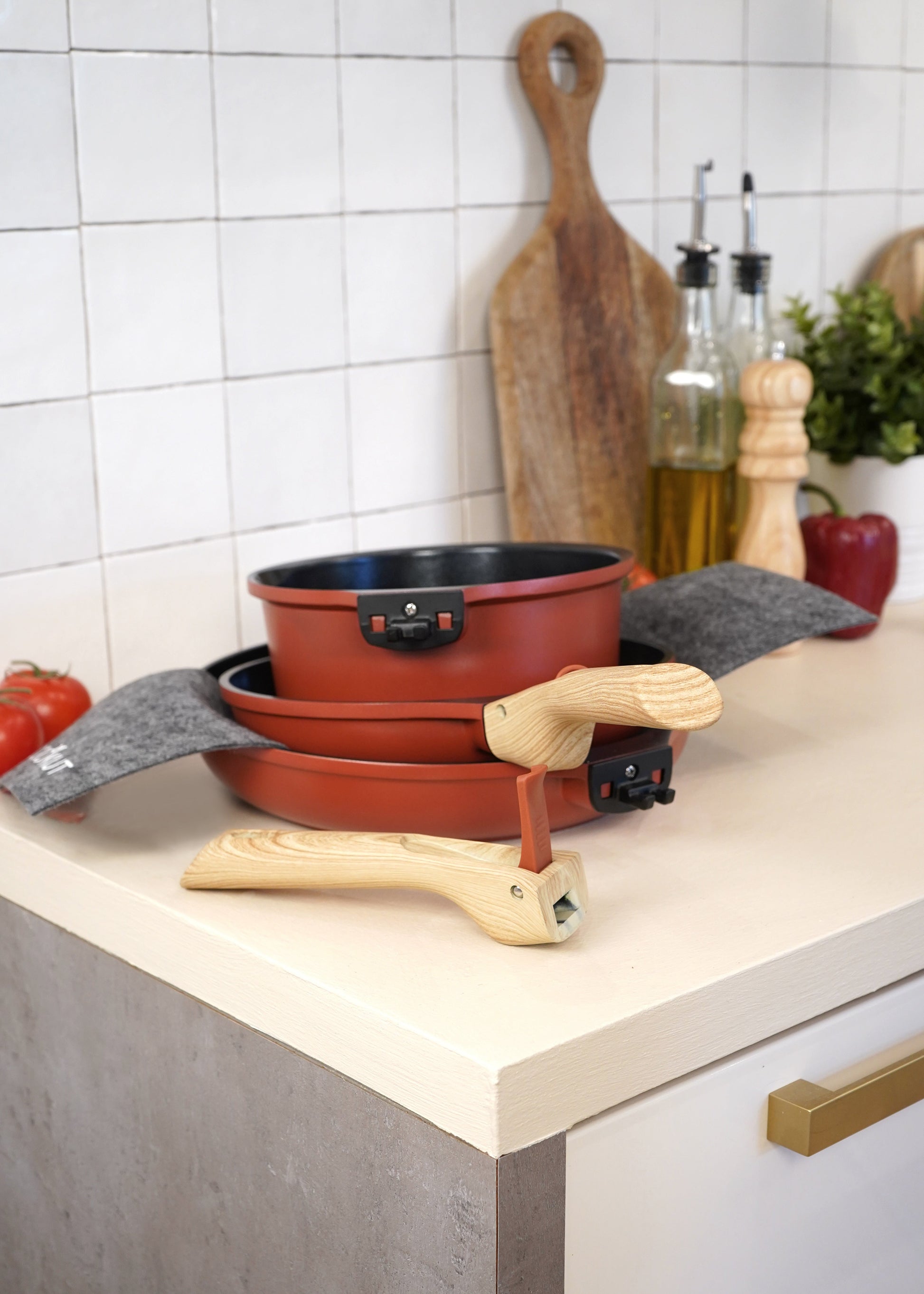 Ce pack contient une casserole 20 cm, une poêle 24 cm, une poêle 28 cm, 2 poignées amovibles et 2 feutrines de protection.