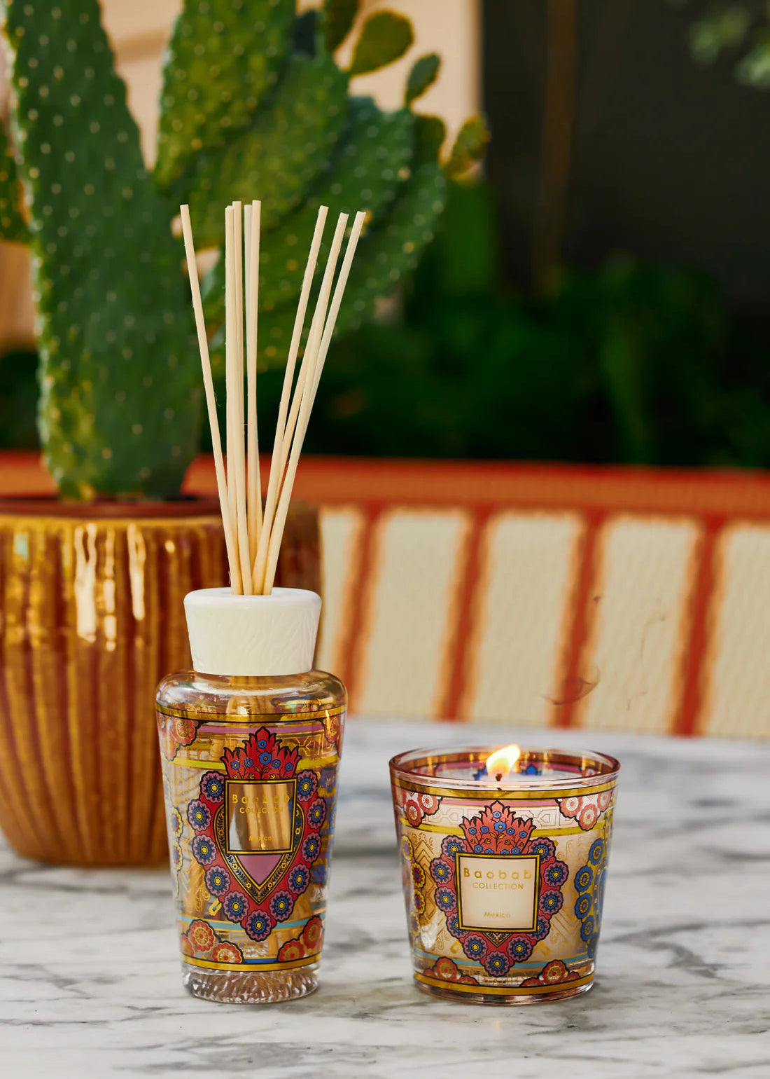 Les diffuseurs de bougie et de parfum parfumées au Mexique sont recouverts d'un imprimé en soie en soie coloré et doré représentant un ancien cœur voto, un petit objet utilisé spirituellement pour répondre à un souhait ou remercier la grâce qui nous a accordé. Ces motifs cardiaques sont placés tout autour du verre, et en bas, nous remarquons un design de broderie subtil rappelant l'artisanat mexicain et les corsages de Frida Kahlo.