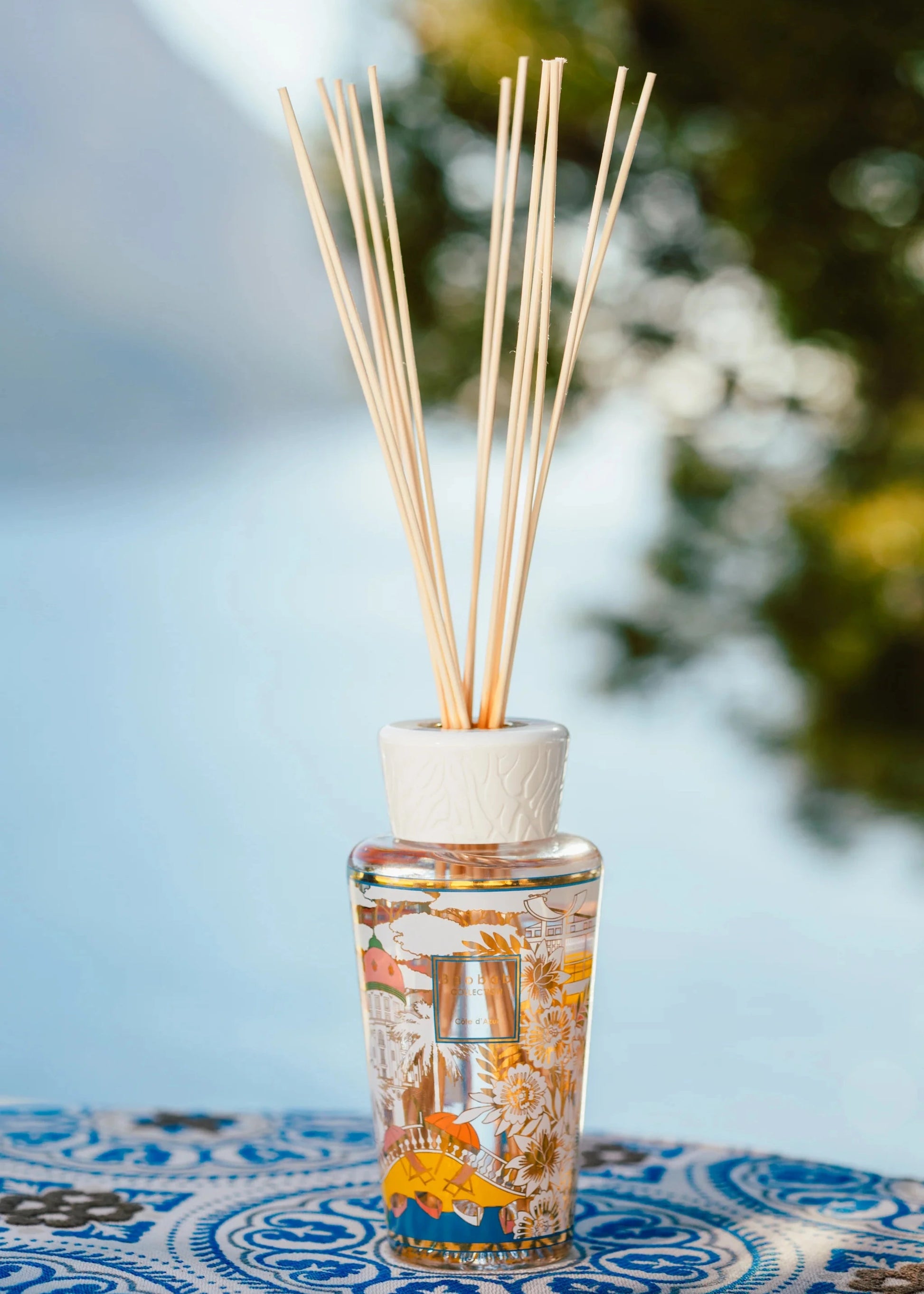 Le décor sérigraphié du diffuseur de parfum Côte d’Azur s’est inspiré de quelques éléments du dessin de Thierry Larcher, comme le Negresco et la mythique promenade des Anglais. Nous avons souhaité aller plus loin en intégrant des éléments architecturaux de la ville de Menton et ceux de la ville de Saint-Tropez. On imagine, dans l’arrière-pays, ces forêts de pins parasols et on rêve de visiter la Fondation Maeght, située dans les hauteurs de Saint-Paul-de-Vence.