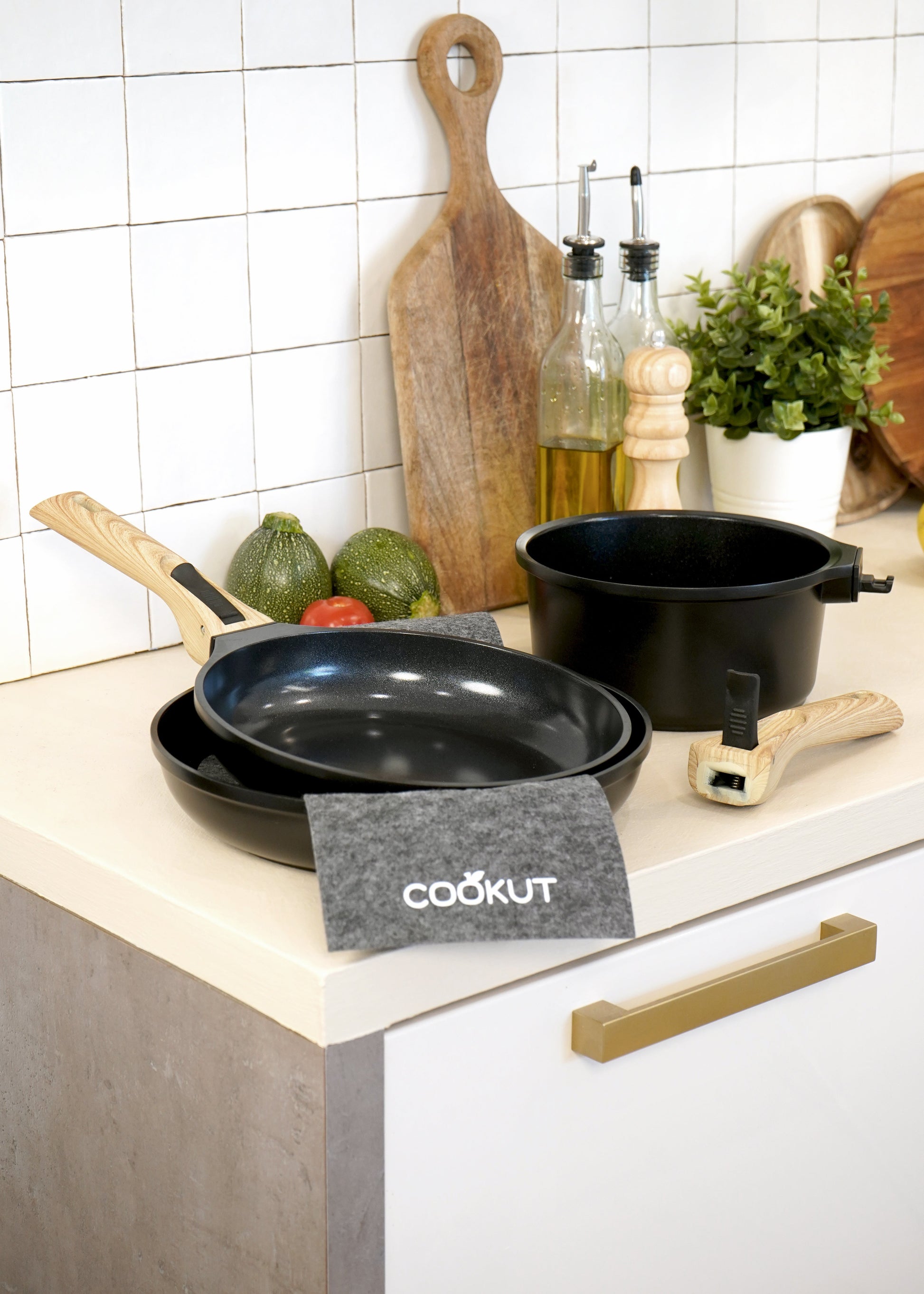 Ce pack contient une casserole 20 cm, une poêle 24 cm, une poêle 28 cm, 2 poignées amovibles et 2 feutrines de protection.