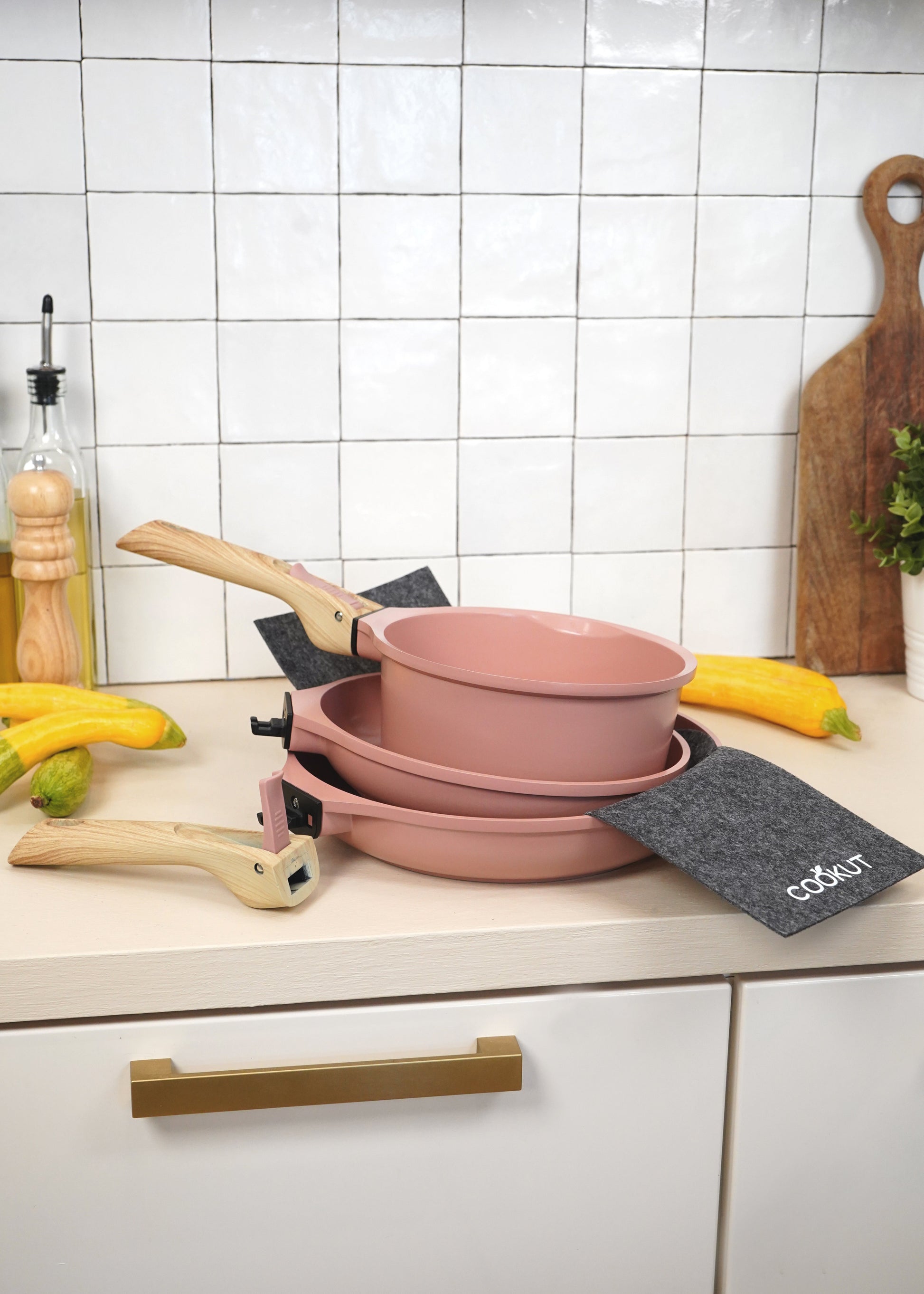 Ce pack contient une casserole 20 cm, une poêle 24 cm, une poêle 28 cm, 2 poignées amovibles et 2 feutrines de protection.