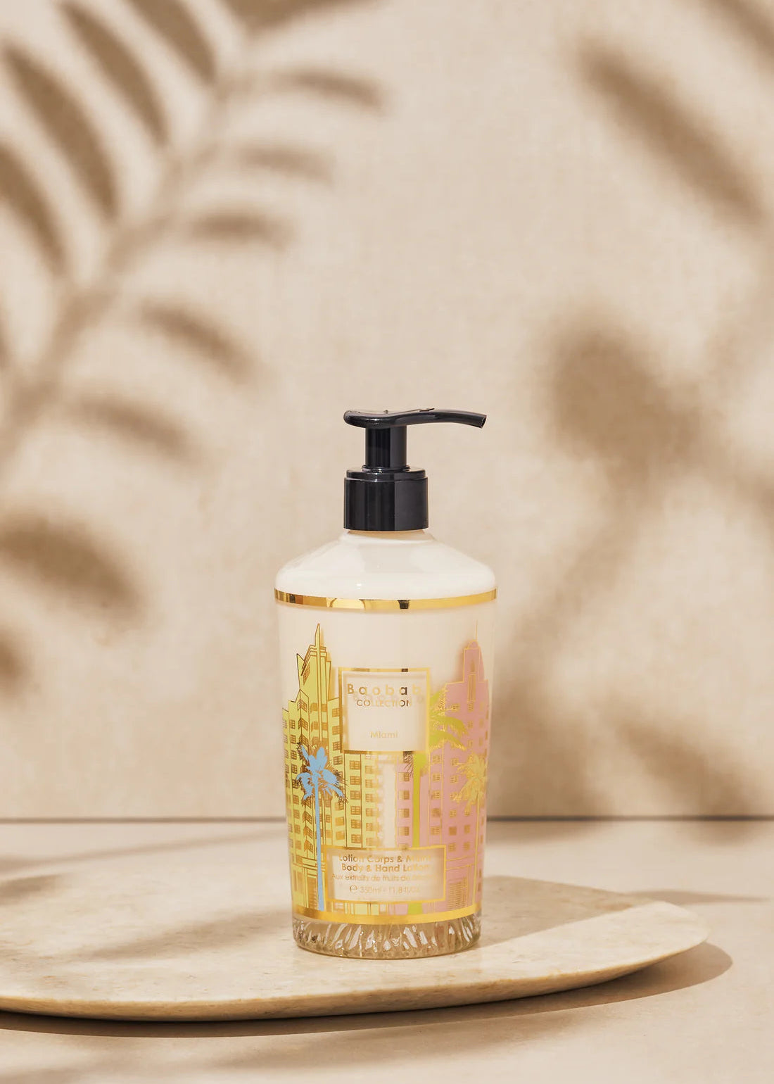 Conditionnée dans un verre décoré d’une sérigraphie d’or et de couleurs pastels représentant les immeubles art déco de South Beach. La lotion corps et mains parfumée Miami se place dans les salles de bains  tel un objet de décoration. On aperçoit à travers le verre la texture de la lotion délicatement colorée jaune pâle laissant ressortir le décor stylisé. A la fois légère et hydratante, la lotion s’applique sur le corps comme une seconde peau, un moment de douceur intime et réconfortant.