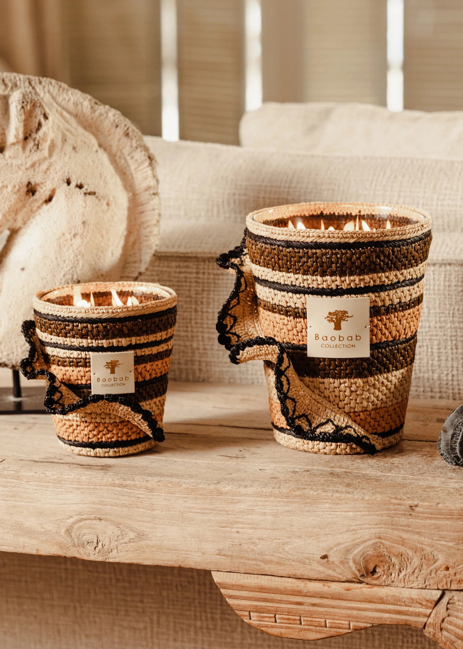 Les couleurs subtiles de rose nude et de kaki se placent en rayures bayadères sur le raphia de la bougie parfumée Anjara. Crochetée à la main par les femmes de Madagascar, cette bougie devient un objet de décoration festif et délicat. Un volant latéral brodé de noir donne à l’objet parfumé une allure d’accessoire de mode.