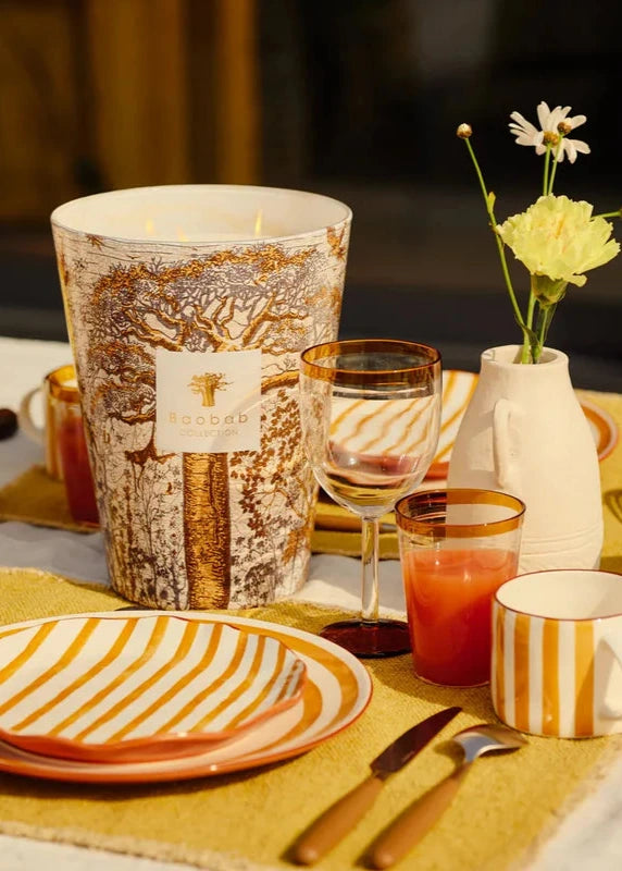 Le décor de la bougie parfumée Dualla est dans ses tonalités probablement le plus africain de toute la collection Sacred Trees Summer. Un baobab orange soleil se dresse sur un fond gris tel un gardien imaginaire surplombant la savane. Un paysage luxuriant où les arbres fleurissent et la faune est en émoi. Ce décor est réalisé par sublimation par des artisans italiens.